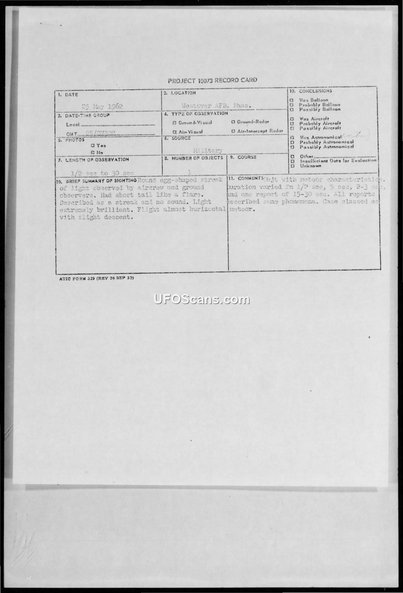 Multiple military personnel at Westover AFB reported a brilliant, egg-shaped object on May 25, 1962. The Air Force officially concluded the sighting was a large, brilliant meteor.
