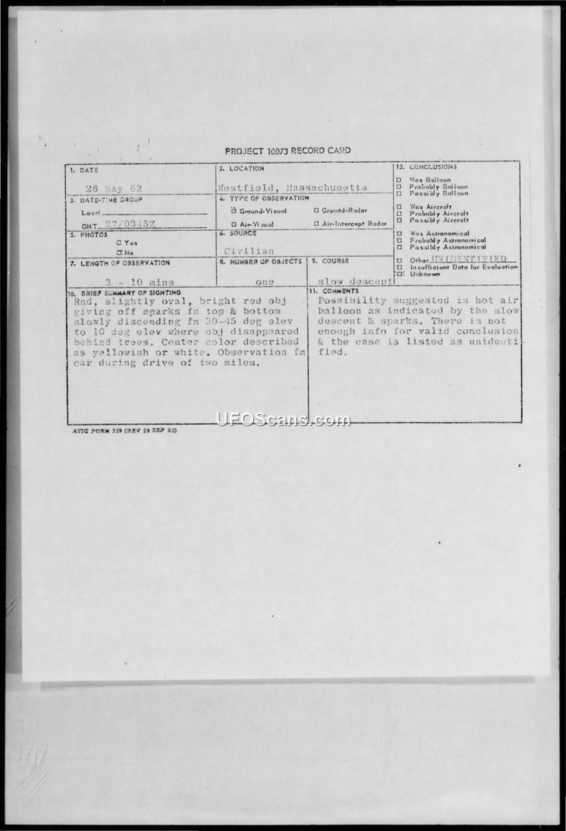 Project 10073 Record Card — Westfield, Massachusetts, 26 May 1962