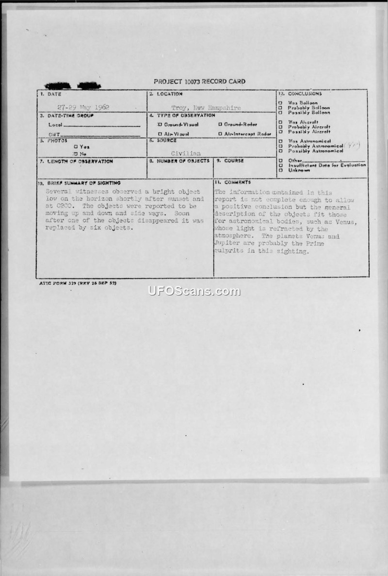 A civilian report from Troy, New Hampshire, describes multiple bright objects moving erratically in the sky. The official military assessment attributes the sighting to the planets Venus and Jupiter.