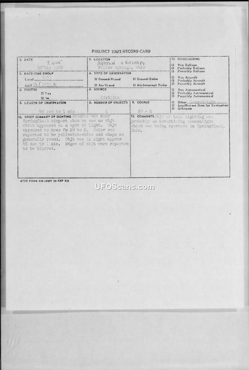 A 1962 sighting report from Project 10073 describes a yellowish-white object observed near Springfield airport. The investigation concluded the object was an advertising searchlight.