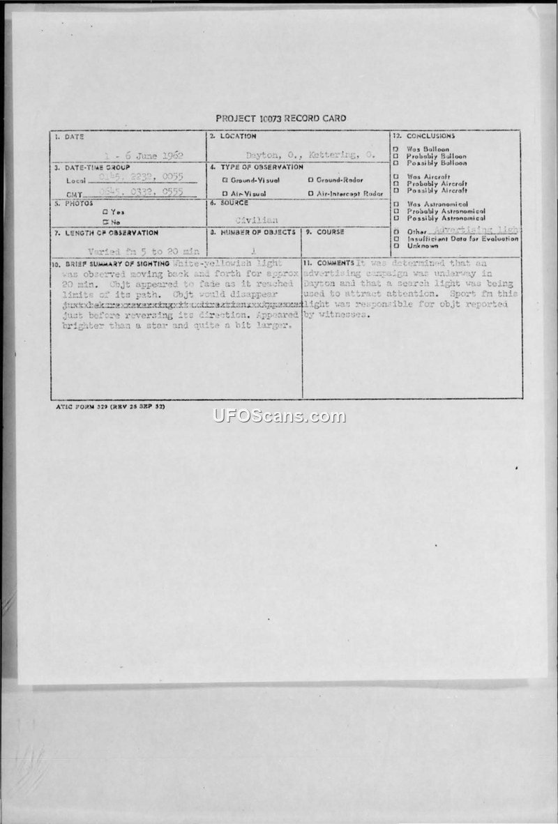 A series of sightings in Dayton, Ohio, in June 1962 were investigated by the U.S. Air Force. The phenomenon was officially identified as a search light used for an advertising campaign.
