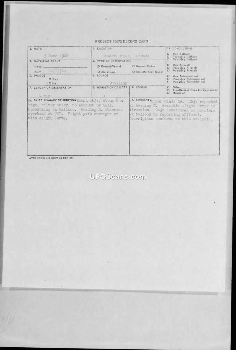 A reliable witness in Dawson Creek, Canada, reported a silver, round object moving against the wind on June 3, 1962. Despite resembling a weather balloon, the object's flight characteristics and lack of radar returns left the incident officially unresolved.