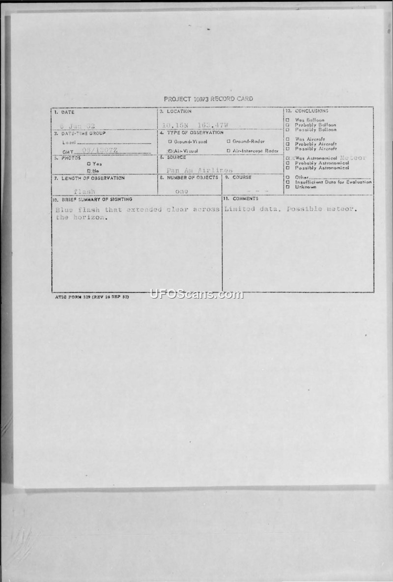 A Pan Am Airlines flight reported a blue flash across the horizon on June 6, 1962. The Air Force evaluated the event as a possible meteor.