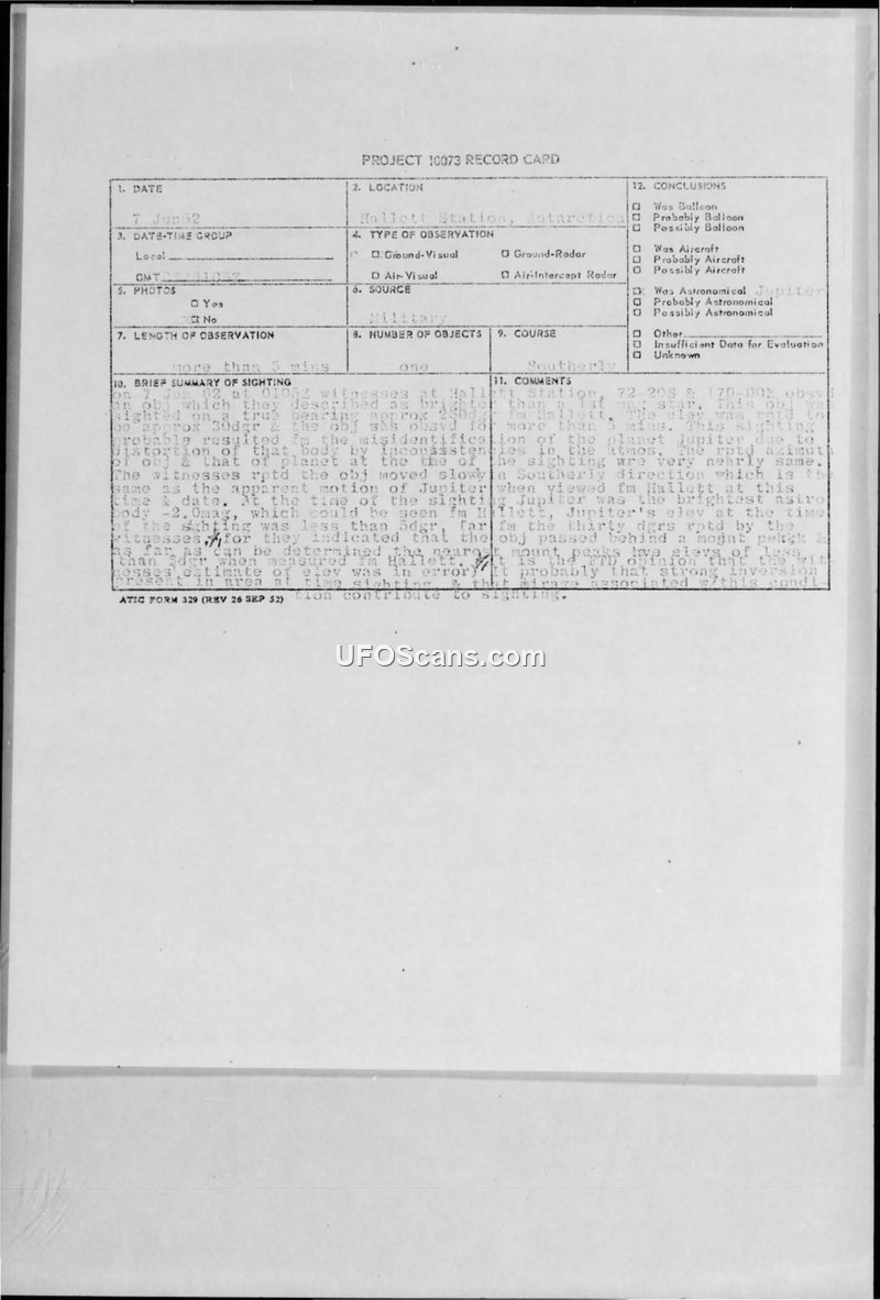 This report details the investigation of three UFO sightings in Antarctica during June and July 1962. The Air Force concluded that all three incidents were natural phenomena, specifically identifying them as the planet Jupiter, a fireball meteor, and a bolide or satellite re-entry.