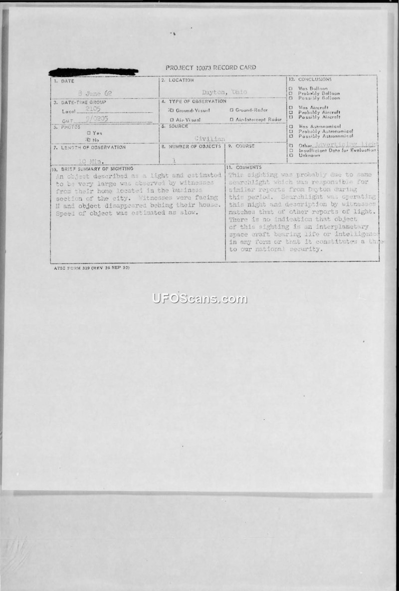 This document contains a series of Project 10073 record cards and associated U.S. Air Force Technical Information Sheets documenting three separate UFO/UAP sightings reported in Dayton, Ohio, during June 1962. The first report, dated June 8, 1962, describes a large light observed for 10 minutes. The official conclusion for this incident was that it was likely a searchlight operating in the area, and it was determined not to be a threat to national security. The second report, dated June 25, 1962, involves a witness who observed a light for approximately one hour. The investigation concluded that the object was the bright star Fomalhaut, which was low on the horizon at the time, and the case was categorized as having insufficient data. The third report, dated June 26, 1962, describes a bright star-like object observed low in the west. The witness reported that through binoculars, the object appeared round and was moving slowly. The official evaluation identified this object as the planet Venus, noting that it was distorted by atmospheric refraction and had a magnitude of -3.5. The documents include detailed questionnaires completed by the witnesses, providing information on their location, the duration of the sightings, weather conditions, and their own descriptions of the objects. The records consistently reflect the Air Force's process of evaluating civilian reports against known astronomical and terrestrial phenomena.