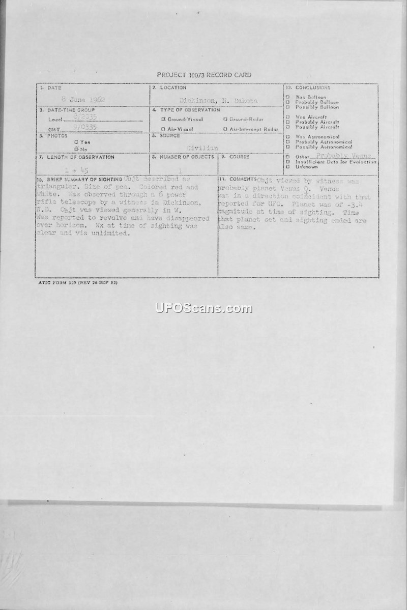 A civilian farmer in North Dakota reported a triangular UFO on June 8, 1962. Military investigators concluded the object was the planet Venus based on its position and magnitude.