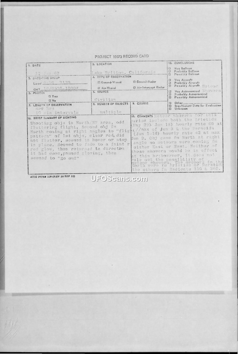A civilian report of multiple objects with 'fluttering flight' and a red glowing object near Lake Britton, California, on June 12, 1962. The Air Force forwarded the report to the Aerospace Technical Intelligence Center for evaluation against potential meteor activity.