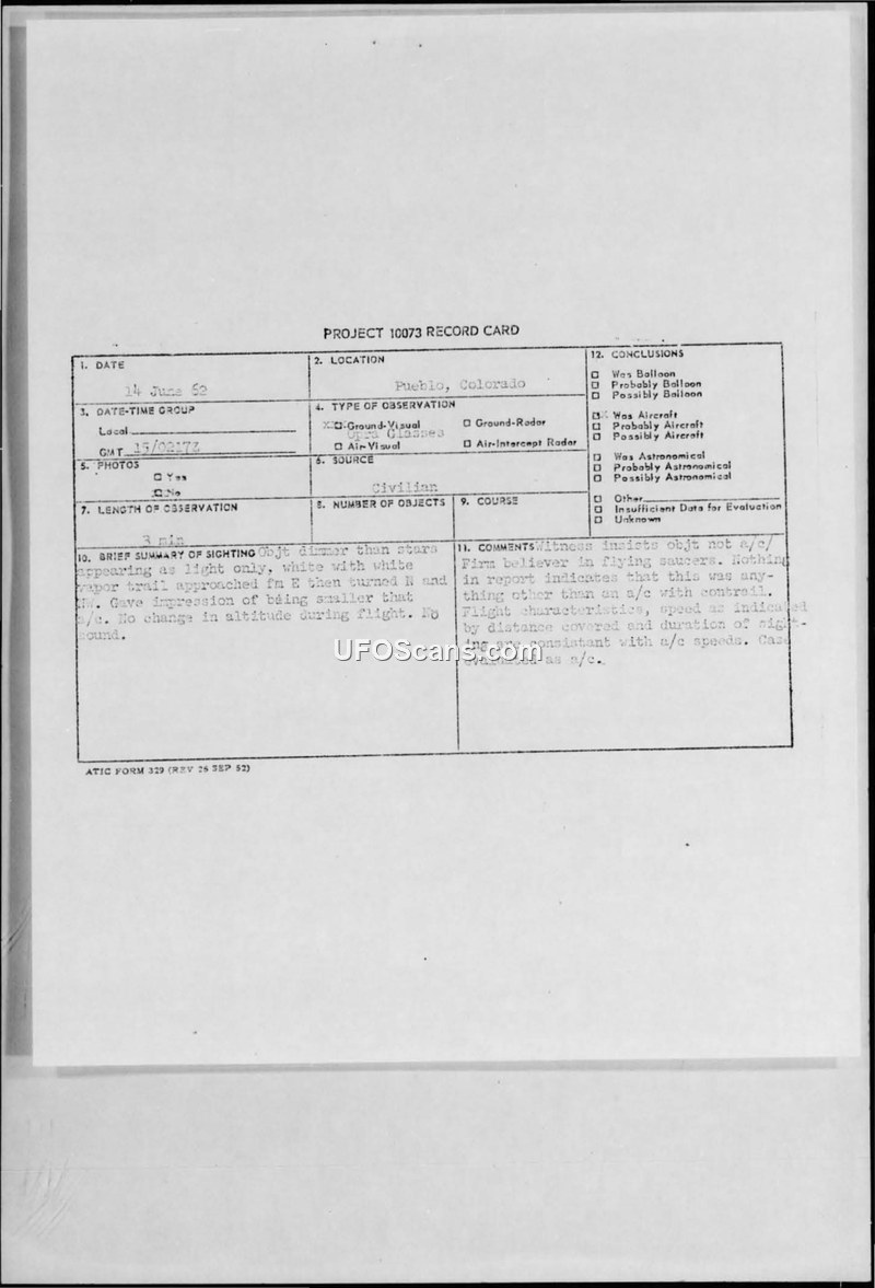 Project 10073 Record Card — Sighting Report, Pueblo, Colorado, 14 June 1962