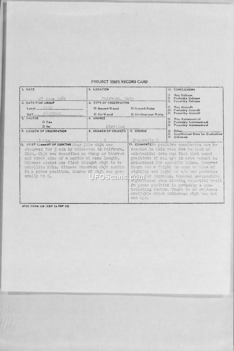 Project 10073 Record Card — Fairborn, Ohio, June 27, 1962