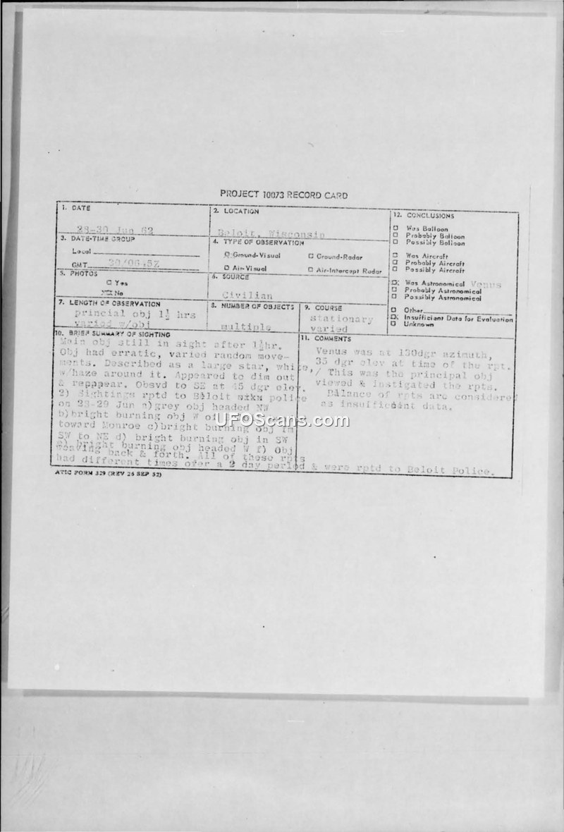 A series of UFO sightings in Beloit, Wisconsin, in June 1962 were officially attributed to the planet Venus by the Air Force. Handwritten notes from the Dearborn Observatory criticize the quality of the reports and the investigative process.