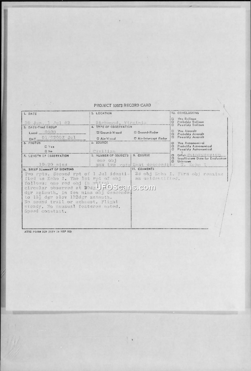 A civilian in Richmond, Virginia, reported an unidentified circular object on 30 June 1962. The Air Force investigated the report but could not identify the object, while a subsequent sighting on 1 July was identified as the Echo I satellite.