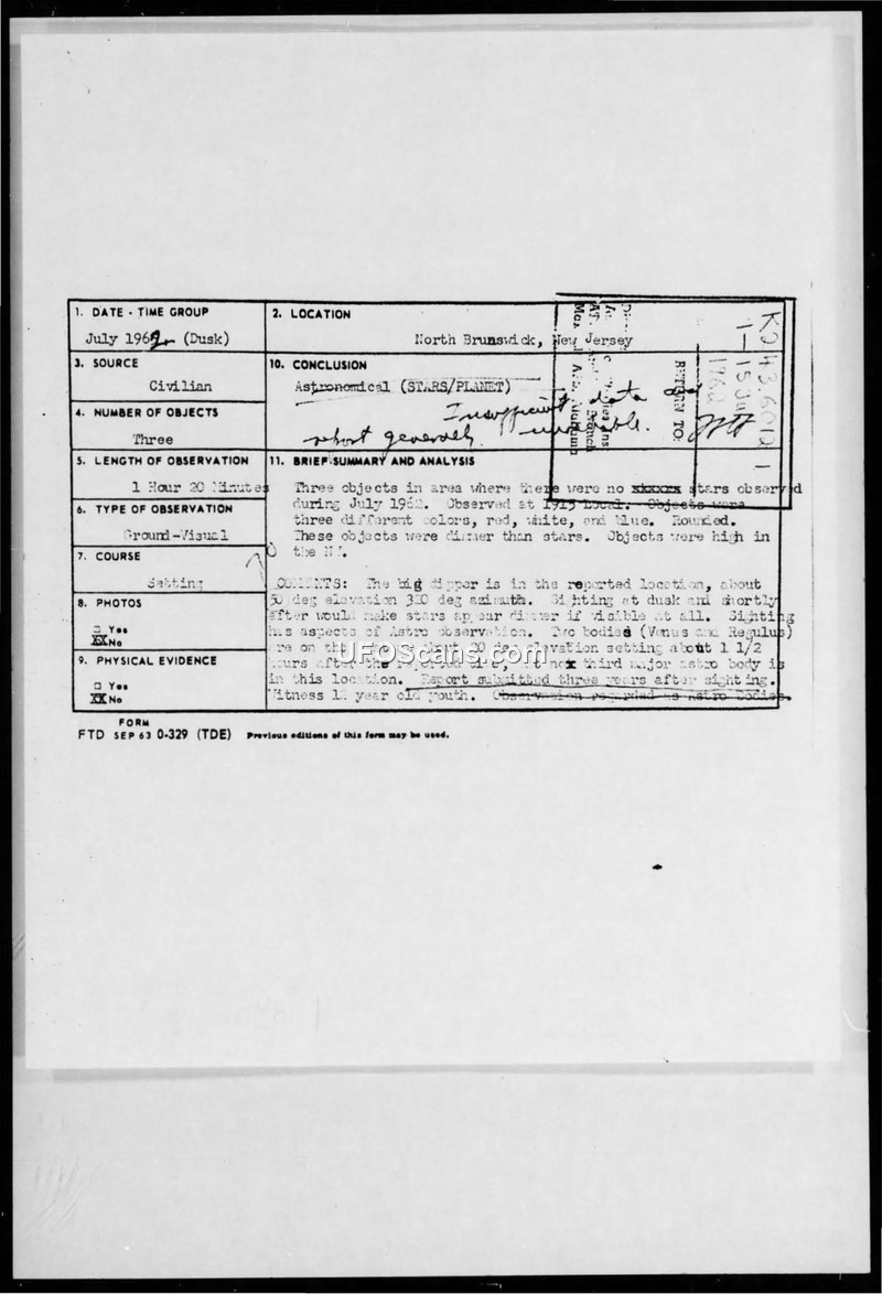 Project Blue Book Sighting Report — North Brunswick, New Jersey, July 1962