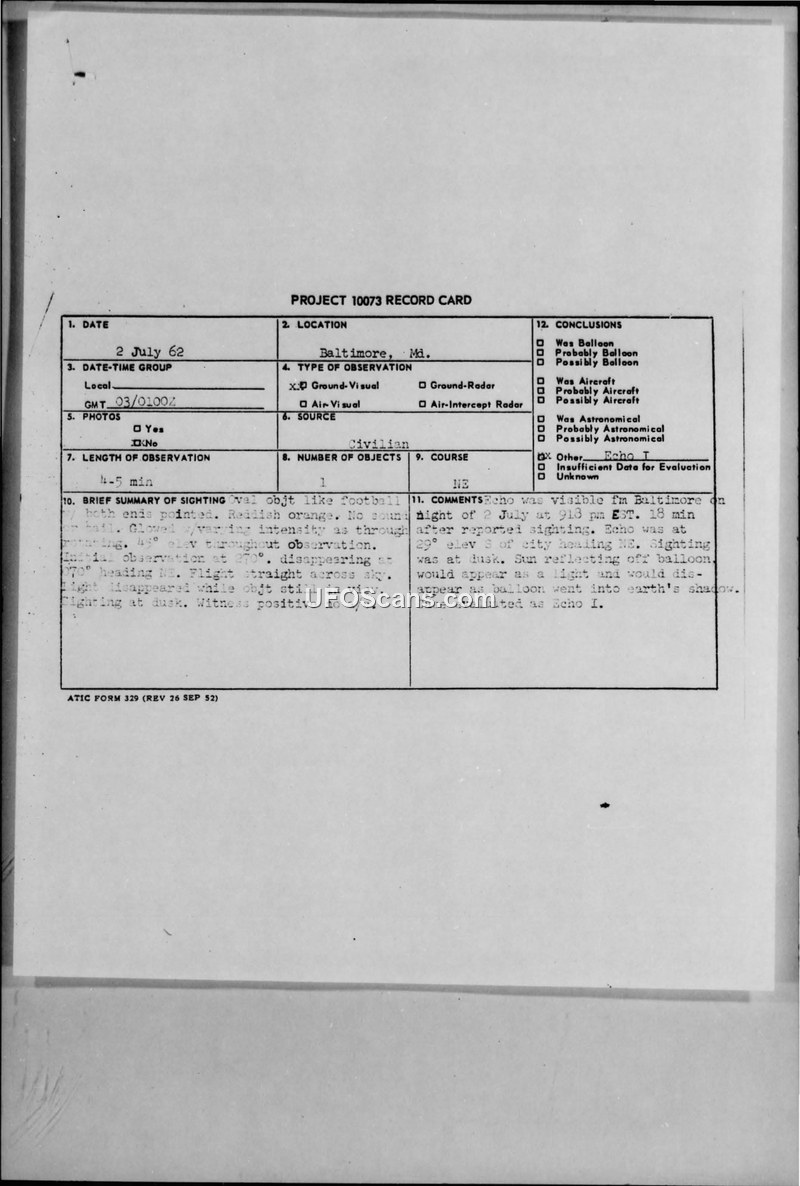 A sighting of an oval, glowing object in Baltimore on 2 July 1962 was investigated by the Air Force. The object was officially identified as the Echo I satellite.