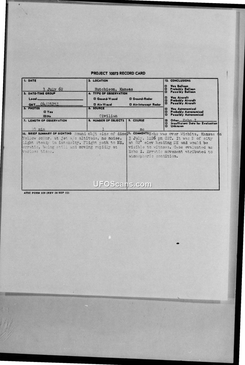 On July 3, 1962, a civilian employee of the city of Hutchison, Kansas, reported observing an unidentified aerial object. The witness, who was accompanied by his wife, described the object as round, yellow in color, and approximately the size of a dime. The sighting lasted for ten minutes, during which the object remained at jet aircraft altitude and made no noise. The witness noted that the object's flight path was to the northeast and that its movement was erratic, alternating between periods of stillness and rapid motion. The report was relayed by Captain Bays of the 793rd Radar Squadron and received by Lieutenant Colonel Olen D. Shepard. The official evaluation of the incident, recorded on the Project 10073 record card, concluded that the object was the Echo I satellite. The erratic movement reported by the witness was attributed to atmospheric conditions.