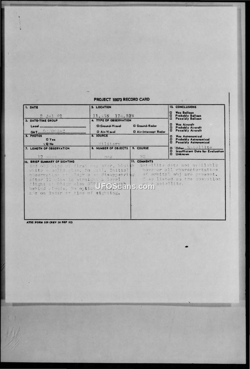 On July 4, 1962, at 0908Z, the crew of the USS FORSTER observed an unidentified aerial phenomenon while at sea at coordinates 11 degrees 45 minutes North, 174 degrees 52 minutes West. The object was described as round, blueish-white, and having the appearance of a first-magnitude star with a solid glow and no tail. The sighting lasted for twelve minutes. The object was first noticed due to its movement in relation to the stars, moving on a northeast course. The observation was made by the Officer of the Deck and confirmed by the Commanding Officer and the bridge watch, all of whom were noted as having previously sighted satellites. The weather conditions were described as a moonlight night with one-tenth cloud coverage. The object eventually disappeared behind low clouds on the horizon. No radar contact was made during the sighting. The incident was documented on a Project 10073 record card and reported via naval message. The official conclusion reached by the Air Technical Intelligence Center (ATIC) was that while satellite data was not available, the characteristics of the object were consistent with an orbital object, and it was classified as a satellite.