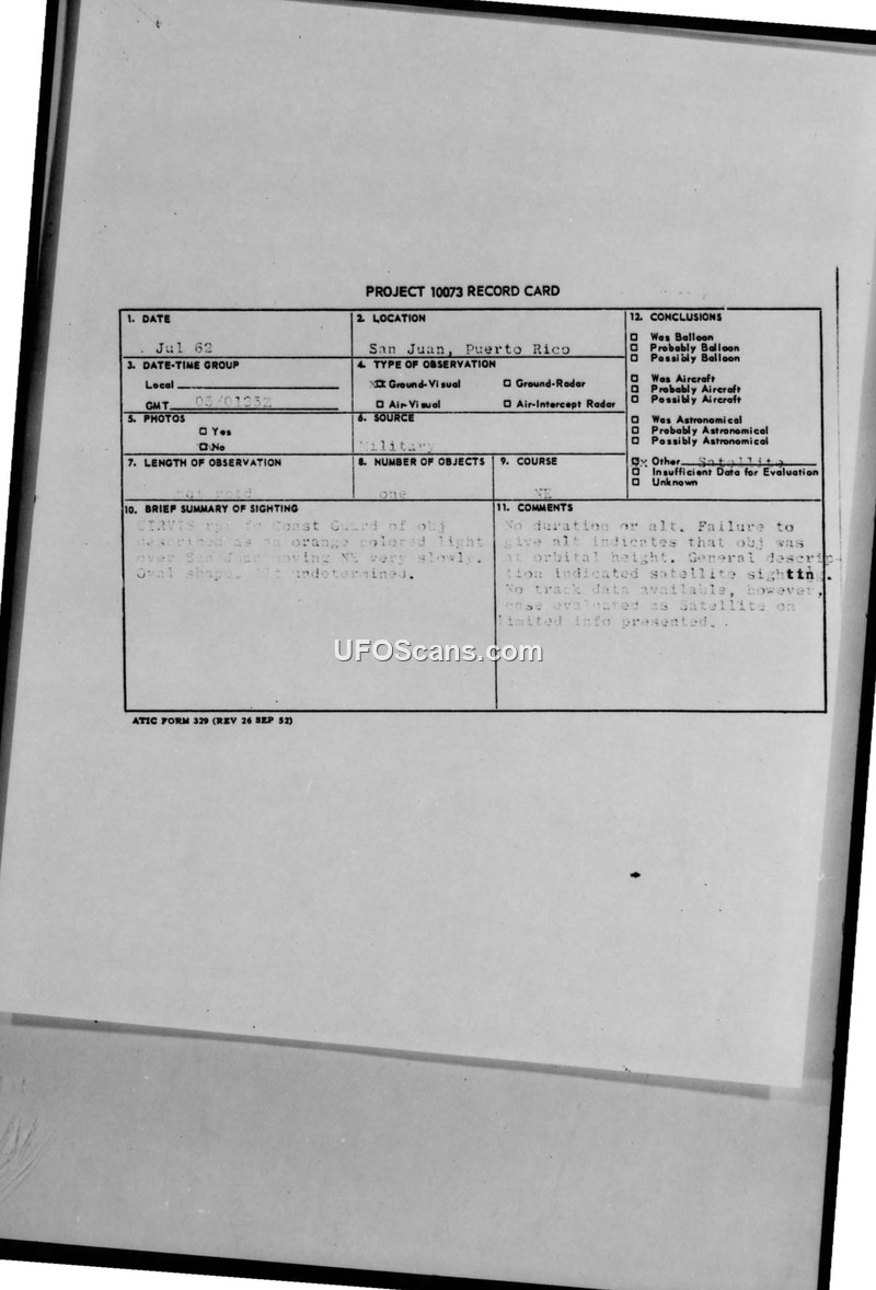 Project 10073 Record Card — San Juan, Puerto Rico, July 1962