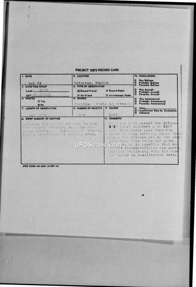 Project 10073 Record Card — Veracruz, Mexico, July 4, 1962