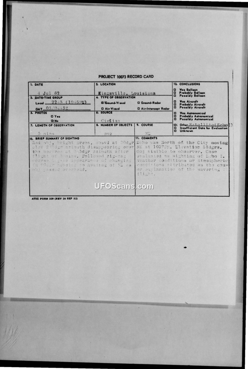 Project 10073 Record Card — Kingsville, Louisiana, 4 July 1962
