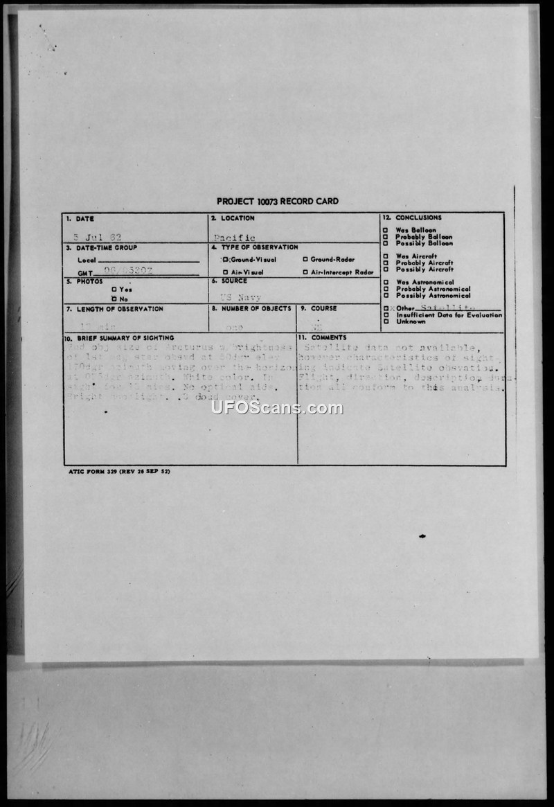 PROJECT 10073 RECORD CARD — USS FALGOUT Sighting, 5 July 1962