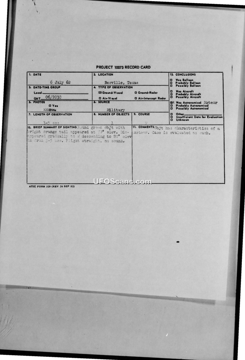A military control tower operator in Beeville, Texas, reported a green, round object with an orange tail on July 6, 1962. The incident was officially evaluated and concluded to be an astronomical meteor.