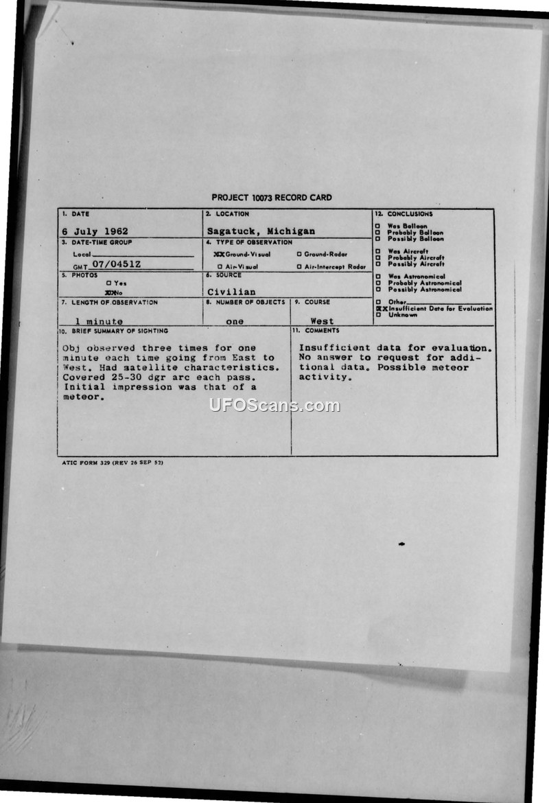 A former SAGE project employee reported a multi-pass UFO sighting over Lake Michigan in July 1962. The Air Force determined the report contained insufficient data for evaluation and received no further response from the witness.
