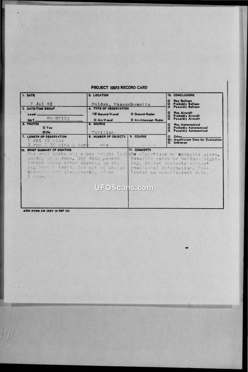 A 1962 sighting report from Malden, Massachusetts, involving an oval object with a bright light. The case was closed as 'insufficient data' due to a lack of positional information.