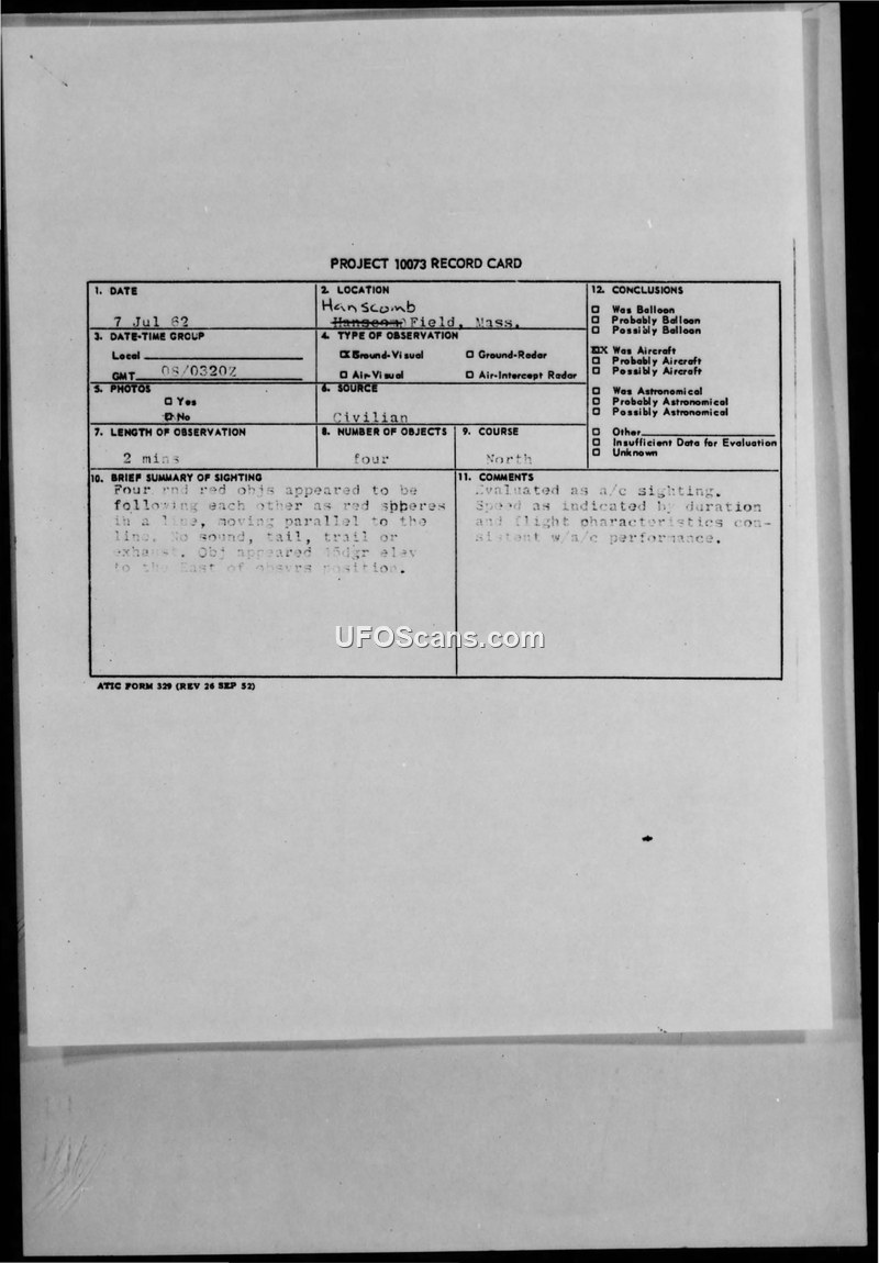 On July 7, 1962, at approximately 0320Z, a staff sergeant serving as a weather observer reported a sighting of four unidentified objects near Hanscom Field, Massachusetts. The observer, who was driving south on a route at the time, noticed the objects while scanning the sky to determine cloud type. The witness described the objects as four red spheres moving in a line, parallel to one another. The observer noted that the objects appeared at an elevation of approximately 15 degrees to the east of their position. The witness reported no sound, tail, trail, or exhaust associated with the objects. The observation lasted for approximately two minutes. The official evaluation of the incident, recorded on a Project 10073 record card, concluded that the sighting was of aircraft, noting that the speed and flight characteristics were consistent with aircraft performance.