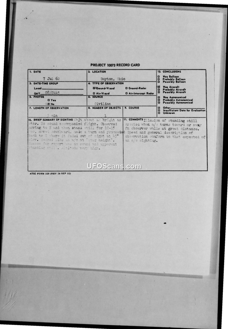 A collection of Project 10073 sighting reports from Dayton, Ohio, in July 1962. The Air Force evaluated these incidents as likely aircraft sightings.