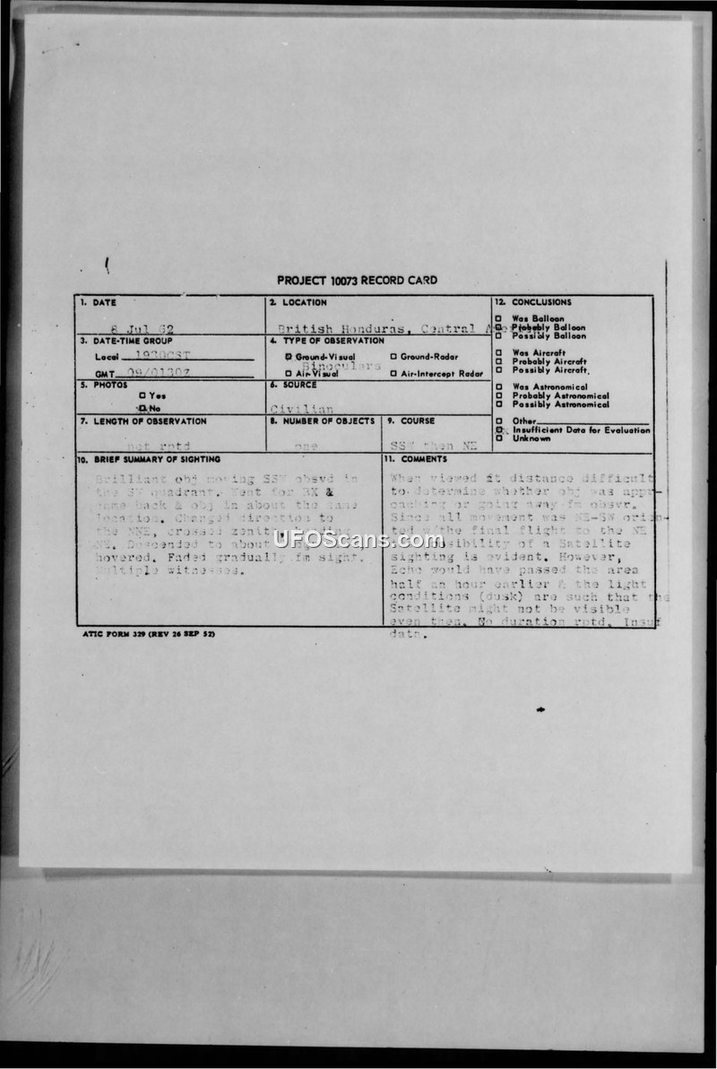 Project 10073 Record Card — British Honduras, 8 July 1962