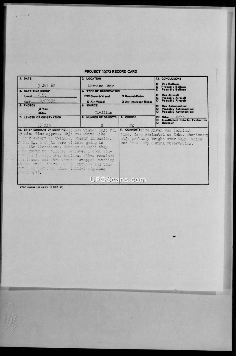 PROJECT 10073 RECORD CARD - Moraine, Ohio - 9 July 1962