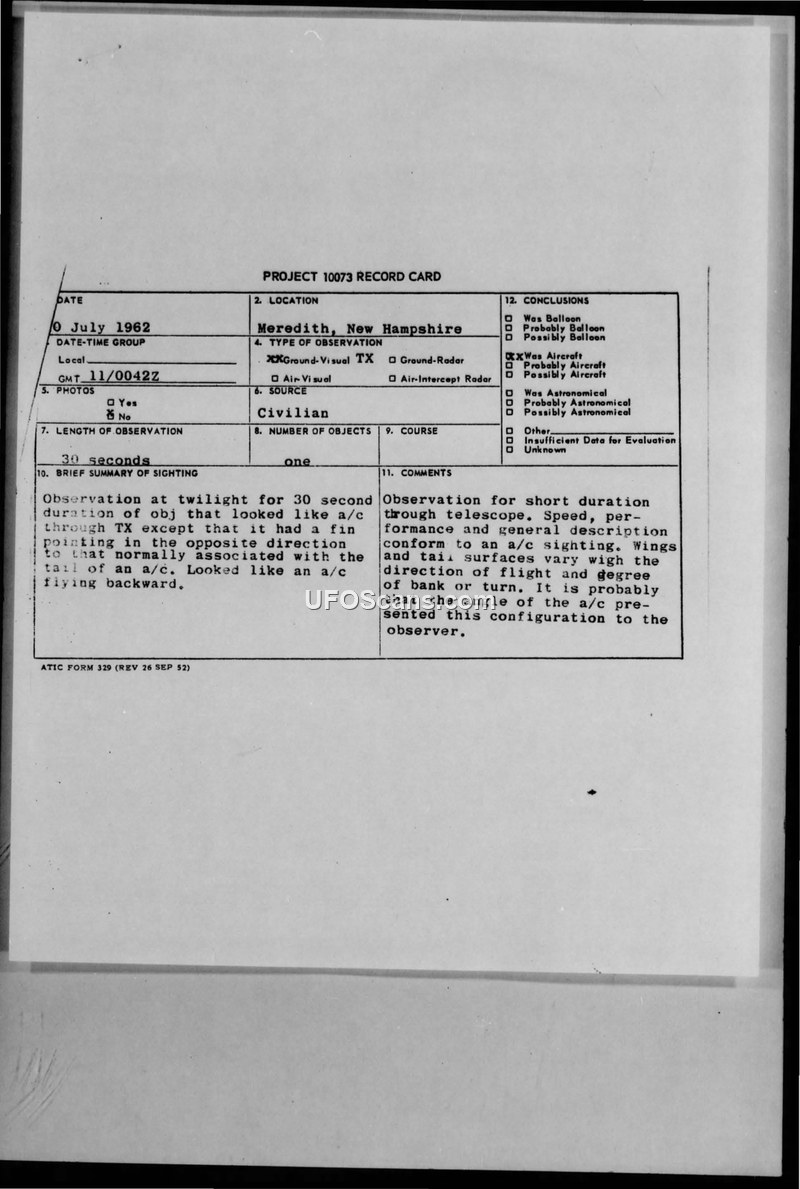 Project 10073 Record Card — Meredith, New Hampshire, 10 July 1962