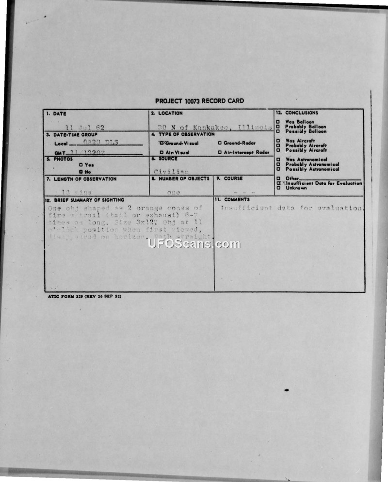 On July 11, 1962, at 0820 DLS, five civilian witnesses observed an unidentified object while traveling on US 54, 30 miles north of Kankakee, Illinois. The witnesses, who utilized binoculars for their observation, described the object as a single entity shaped like two orange cones of fire, measuring approximately 3 by 12 inches, with a tail or exhaust that was 6 to 7 times the length of the object. The object maintained a straight flight path before disappearing on the horizon. The observation lasted for 15 minutes. The incident was reported by the 64th Troop Carrier Squadron, Medium (Reserve) at O'Hare International Airport to the Air Technical Intelligence Center at Wright-Patterson Air Force Base, in accordance with AFR 200-2. The official conclusion reached by the evaluating authorities was that there was insufficient data for a formal evaluation, though it was explicitly noted that the object was neither a falling star nor a jet.