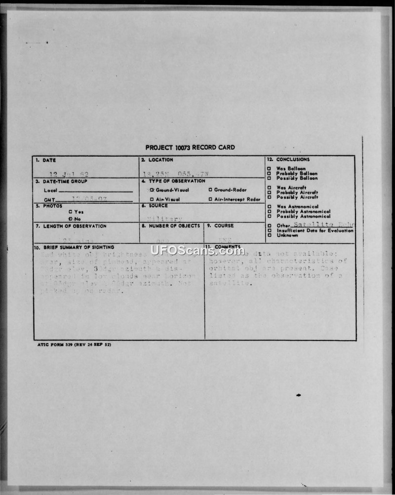 Project 10073 Record Card and Naval Message — USS Falgout Sighting, 13 July 1962