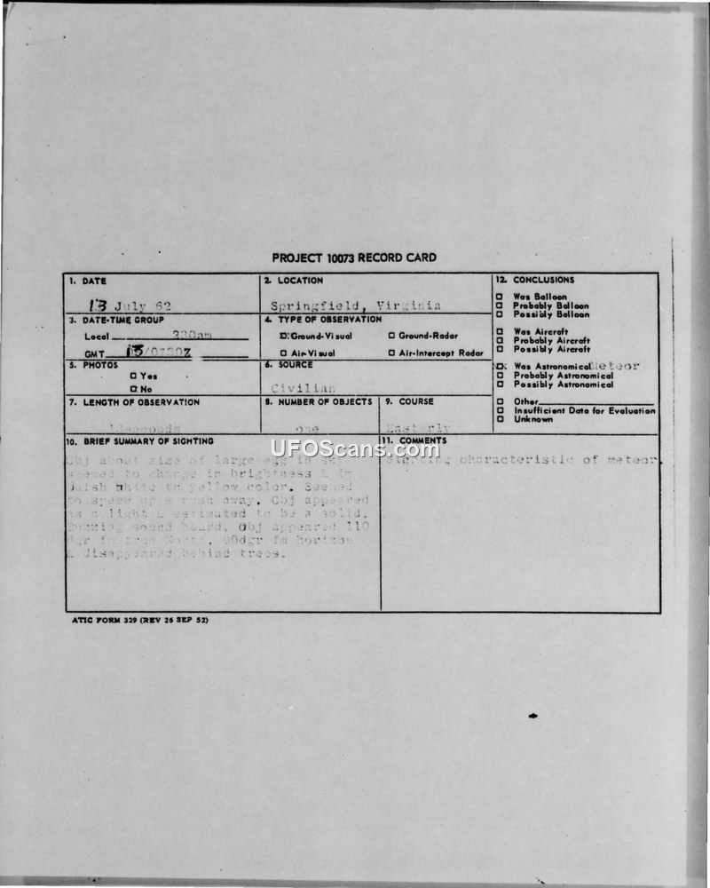 A 15-year-old witness reported an oval, glowing object in Springfield, Virginia, on July 13, 1962. The Air Force investigated the report and concluded the object was a meteor.