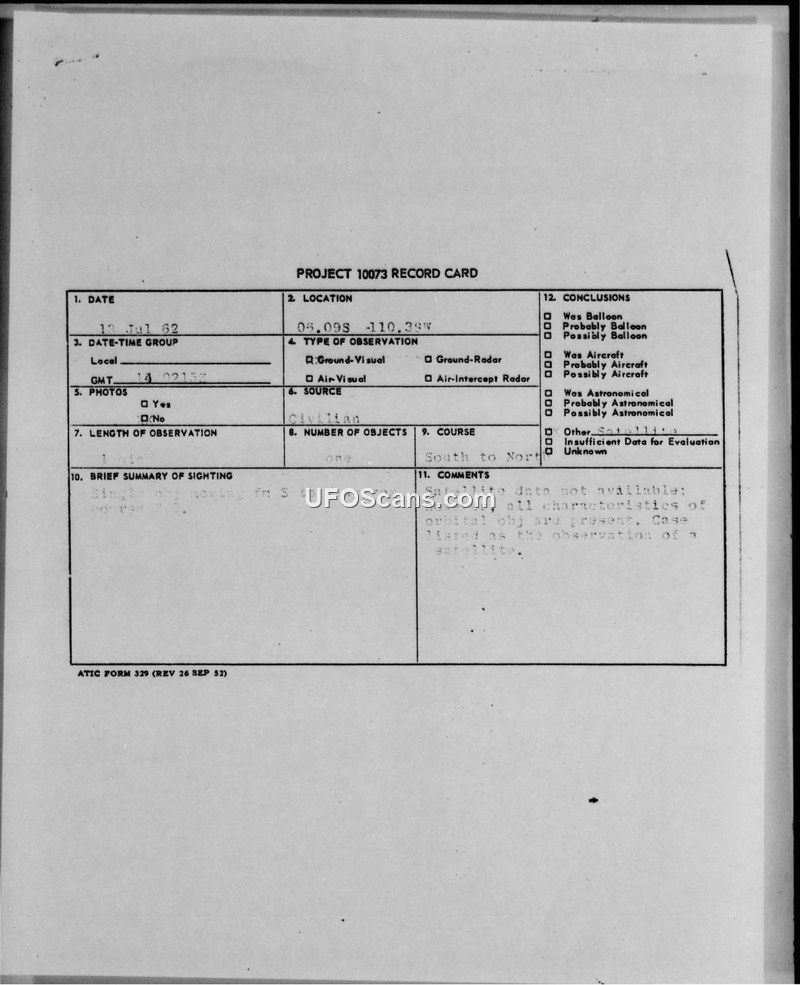 PROJECT 10073 RECORD CARD — 14 July 1962