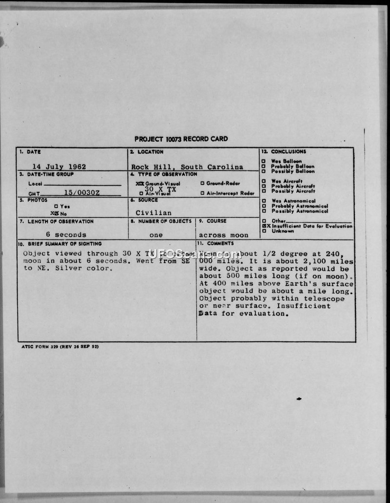 This document consists of a Project 10073 record card and associated correspondence regarding a UFO sighting reported in Rock Hill, South Carolina, on 14 July 1962. A civilian witness reported observing a silver-colored object through a 30X telescope as it crossed the moon in approximately six seconds, traveling from the southeast to the northeast. The Foreign Technology Division at Wright-Patterson Air Force Base initially contacted the witness on 2 November 1962, informing them that their initial letter lacked sufficient information for a proper evaluation and requesting the completion of an enclosed AF Form 164. The record card includes technical notes calculating the potential size of the object based on its transit across the moon, noting that if the object were on the moon, it would be 500 miles long, whereas at 400 miles above the Earth's surface, it would be approximately one mile long. The final assessment concluded that the object was likely within the telescope or near the surface, ultimately classifying the incident as having insufficient data for evaluation.