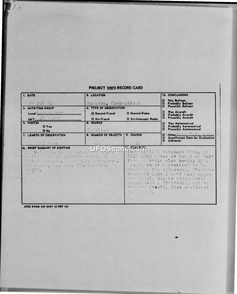 Project 10073 Record Card - Meriden, Connecticut Sighting