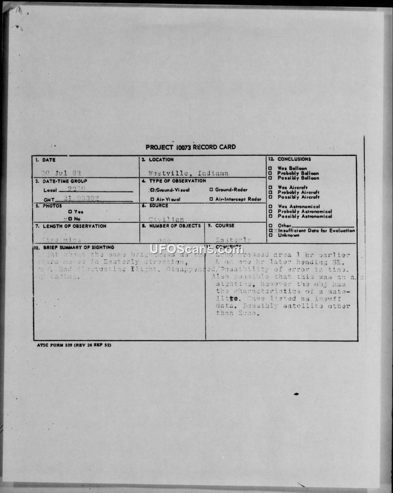 Project 10073 Record Card — Westville, Indiana, 20 July 1962