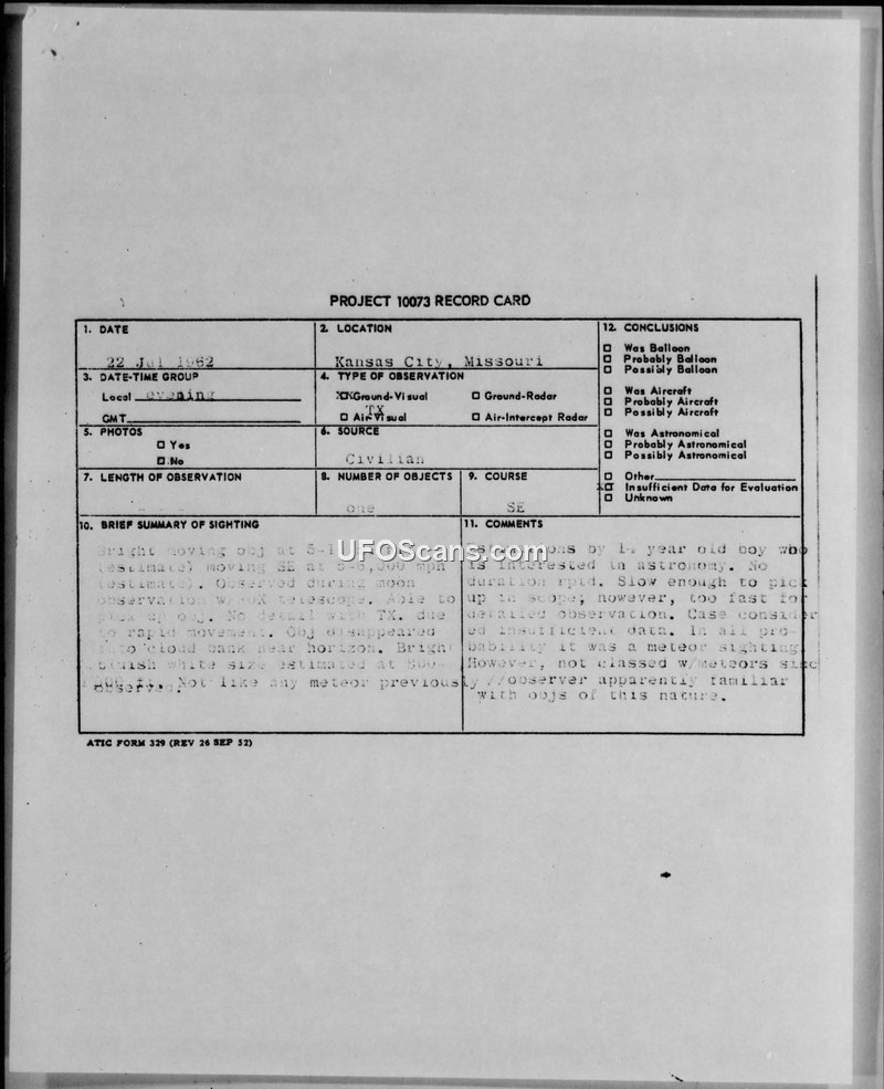 Project 10073 Record Card — Kansas City, Missouri, July 22, 1962