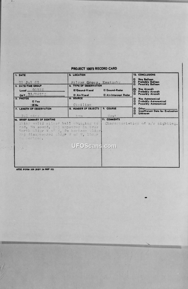 Project 10073 Record Card — Silver Grove, Kentucky, 25 July 1962