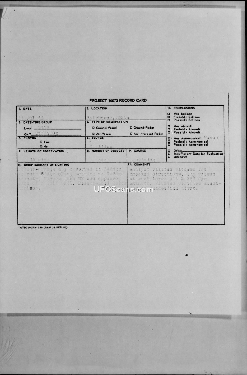 A civilian in Fairborn, Ohio, reported a yellow-orange object on July 26, 1962. ATIC investigators concluded the object was the planet Venus.