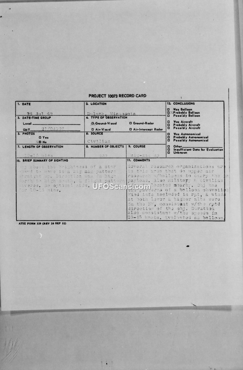 On July 27, 1962, at 0430Z, a 44-year-old railroad switchman in Duluth, Minnesota, observed an unidentified object while working at a railroad yard located at 600 Garfield Avenue. The witness described the object as appearing like a bright star. Over a duration of 10 to 15 minutes, the object moved from the north to the south, performing a zig-zagging motion three or four times before appearing to move straight up into a haze. The witness was accompanied by two co-workers, though their names were not provided in the report. The weather conditions at the time were reported as clear and cool with unlimited visibility. The incident was reported through military channels, specifically reaching the Chicago Air Defense Sector at Truax Field, Wisconsin. The Air Technical Intelligence Center (ATIC) evaluated the report under Project 10073. The official conclusion reached by the investigators was that the object was a balloon. This determination was based on the presence of research organizations in the area that conduct upper-air research using balloons, as well as an analysis of wind data. The investigators noted that winds at both lower and higher altitudes were from the northwest, which was consistent with the reported direction of the object and the estimated speeds of 25 to 15 knots.