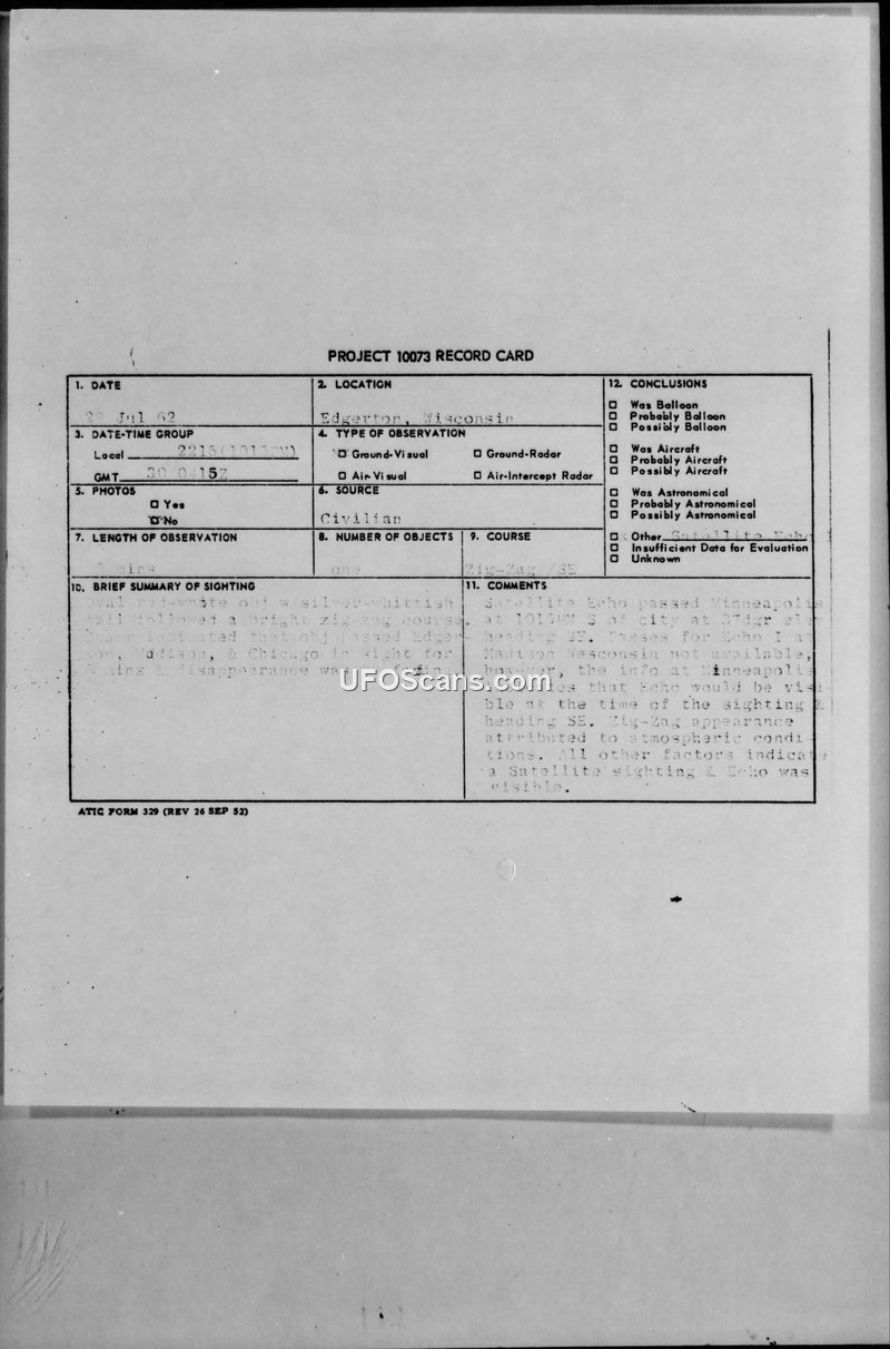 This document consists of a Project 10073 record card and an associated incoming military message regarding a UFO sighting reported on July 29, 1962, in Edgerton, Wisconsin. The witness reported observing a single, oval-shaped, red-white object with a silver-whitish tail. The object was described as following a zig-zag course over the Madison-Edgerton-Chicago area for a duration of five minutes before fading out of sight. The report notes that the observation was visual only, with no radar contact or photographic evidence. The official military evaluation, conducted by the Air Technical Intelligence Center (ATIC), concluded that the object was the Echo satellite. The report explains that the Echo satellite passed Minneapolis at 10:15 PM, and while specific pass data for Madison was unavailable, the Minneapolis data suggested visibility at the time of the sighting. The reported zig-zag motion was attributed to atmospheric conditions, and the military concluded that the sighting was a satellite.