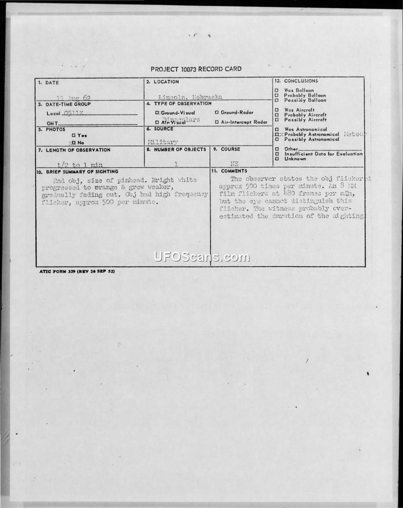 Project 10073 Record Card and UFO Report - Lincoln, Nebraska, 12 August 1959