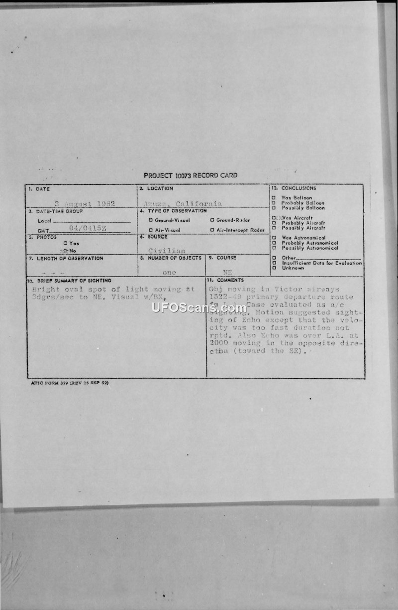 A 1962 report of a bright, oval light observed by two students in Azusa, California. The Air Force concluded the object was likely an aircraft departing from a Los Angeles area airport.