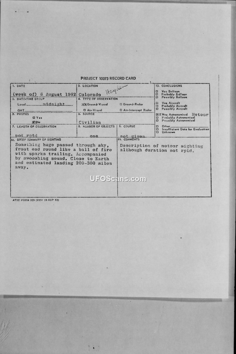 Project 10073 Record Card — Sighting of 6 August 1962, Colorado
