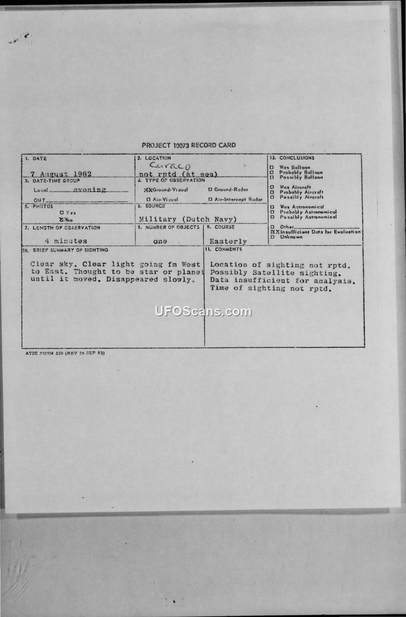 Project 10073 Record Card — Curacao, 7 August 1962