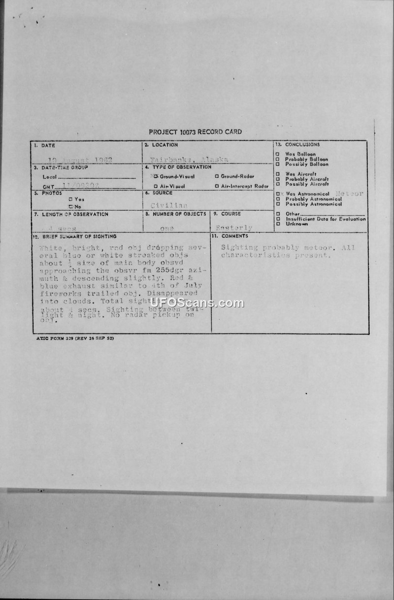 A civilian engineer in Alaska reported a bright, round object dropping smaller, streaked objects on August 11, 1962. The Air Force concluded the event was likely a meteor.