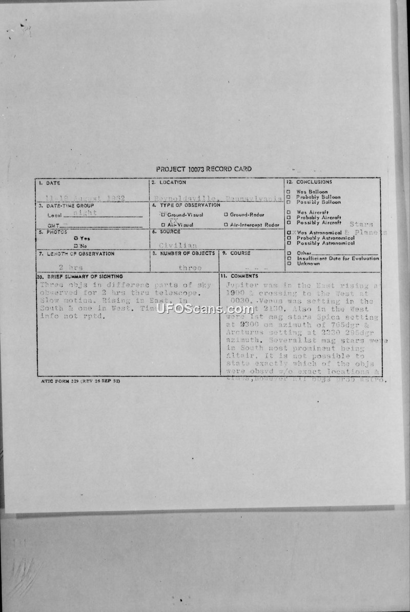 A 15-year-old witness reported three unidentified objects in the sky in August 1962. The Air Force investigated and concluded the objects were likely astronomical bodies, specifically planets and stars.