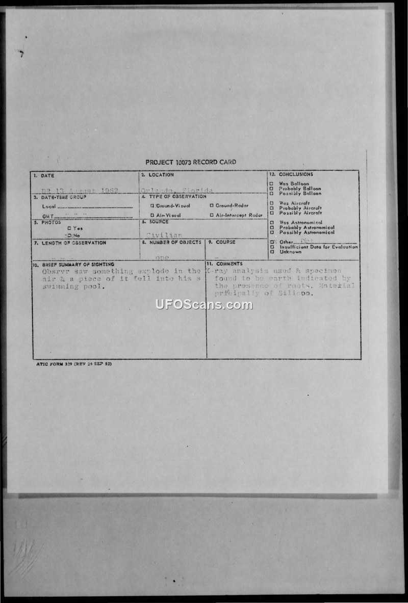 A civilian reported an aerial explosion in Orlando, Florida, in 1962. Laboratory analysis of the recovered material determined it was earth and silicon, not a meteorite.